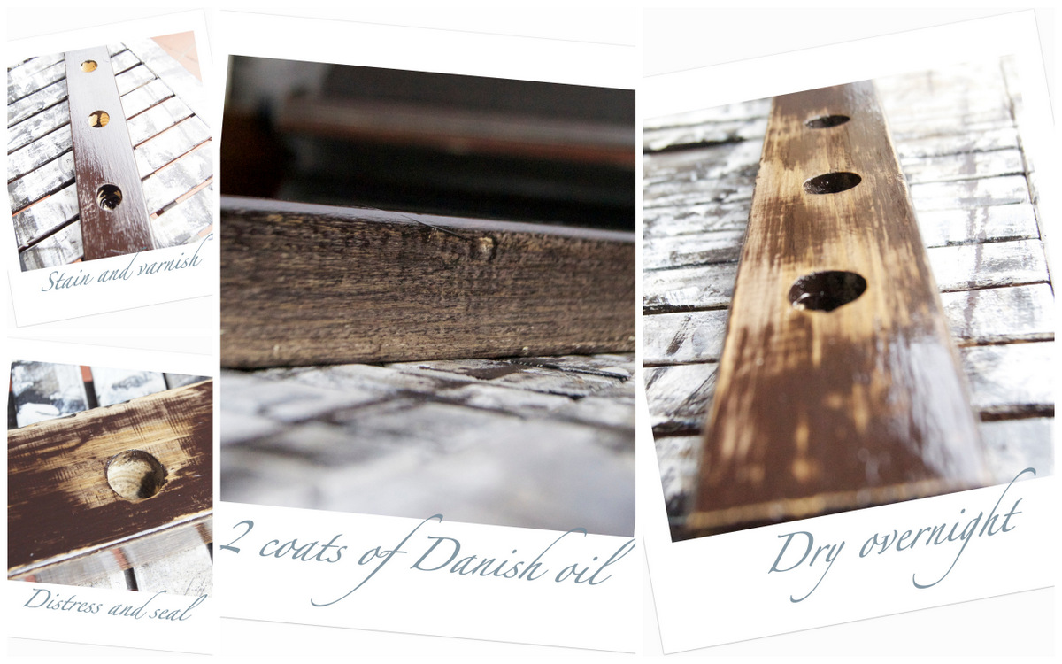 Step 2 is to stain, distress, seal with Danish oil and leave to dry