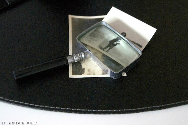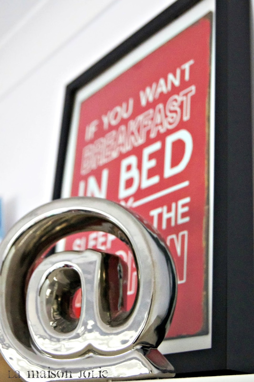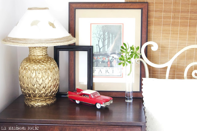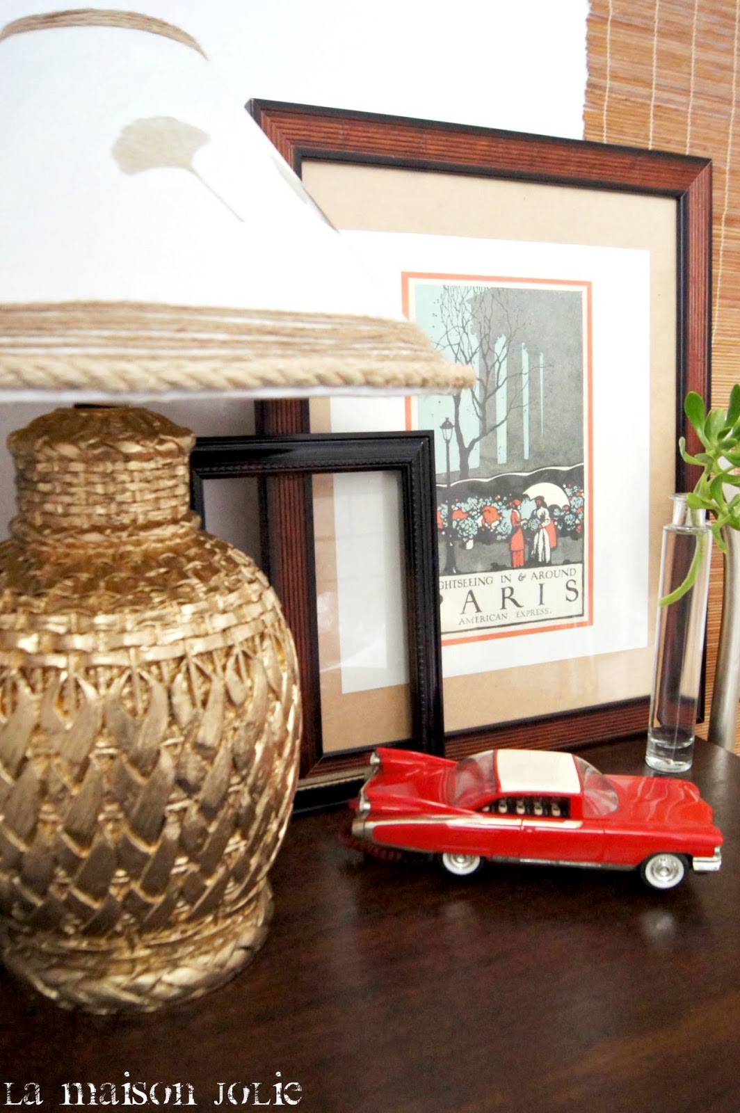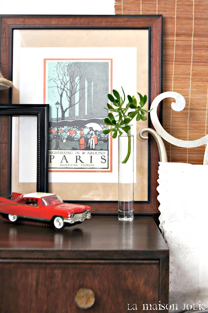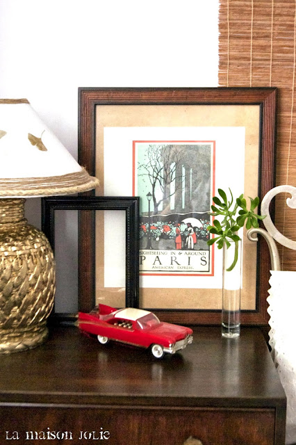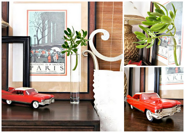 The vintage car is actually a phone! But it's not connected. I just used it to add a fun element to the vignette. And the reddish orange car matches the border of the poster.
