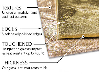 Golden Glass is a new and quite a unique design element. Developed in Italy by a designer glass brand, this collection is sold and installed by CreoGlass in UK. It is stunning and luxurious! You can choose from various textures such as animal skins and abstract patterns, which look beautiful and have a flat smooth glass finish.