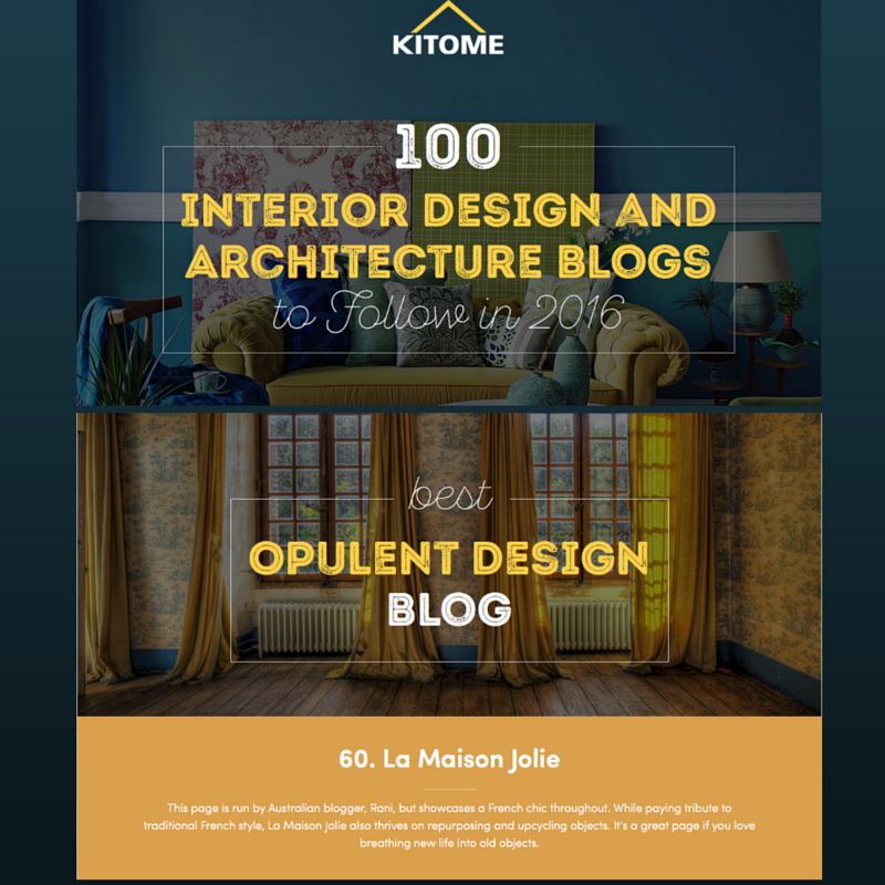 | Thank you Kitome for featuring La Maison Jolie Design Blog in 100 Interior Design and Architecture Blogs to follow in 2016! Read all about it here |